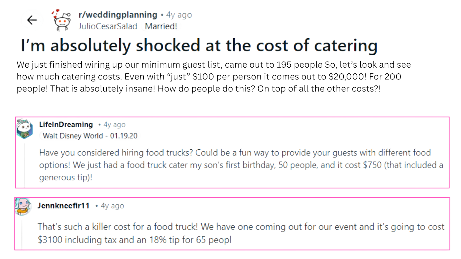 | Buffet Catering | $20,000 for 200 people | $100 |